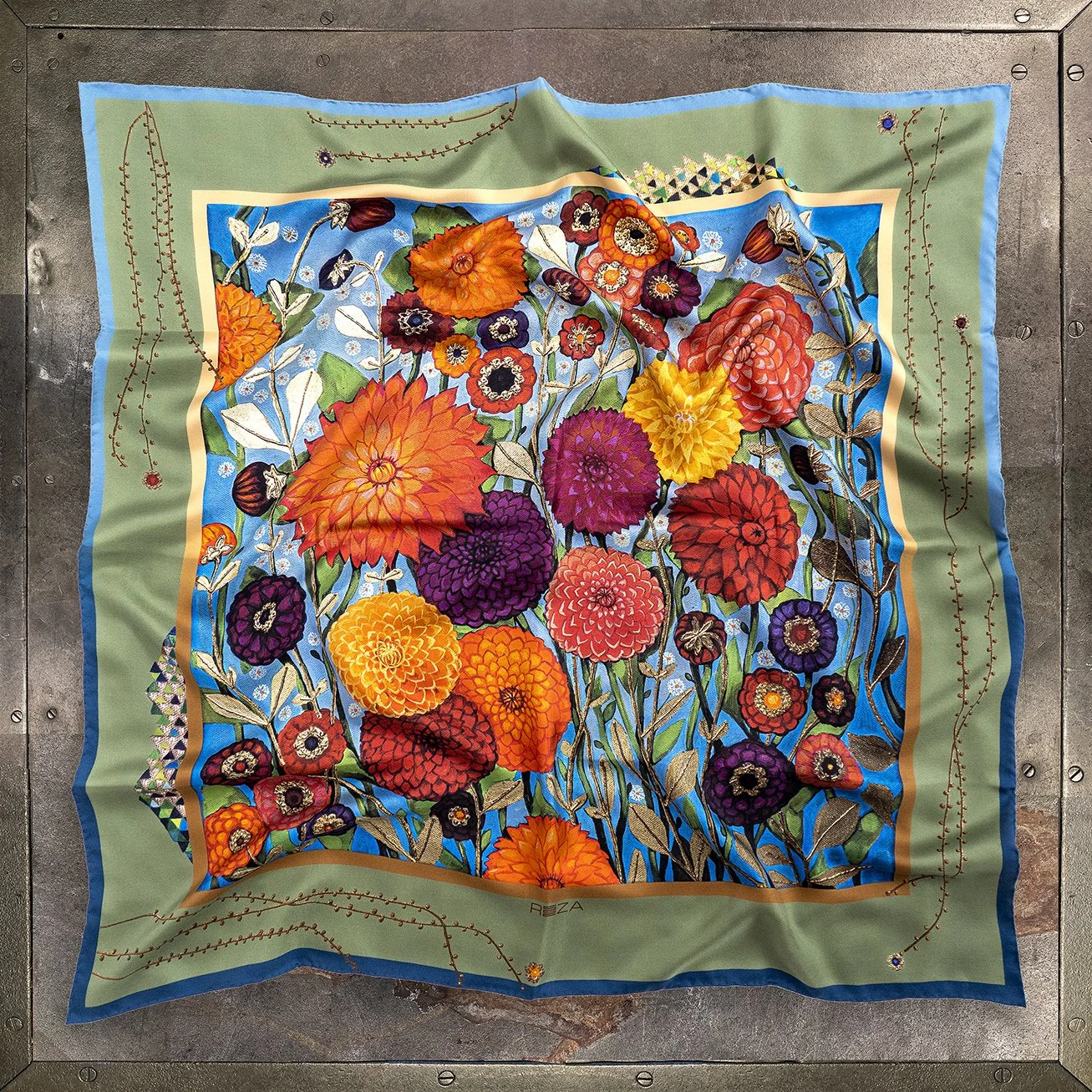 With this group of scarves we aimed to create fashion pieces that evoke joyful feelings in the wearer, and will take their style to a level which is simple and not overdone. Just the right amount of cool to make life worth dressing for. The collection’s vibrant aesthetic is informed by many interest and extended research which are in the core of Roza’s rich portfolio of artworks. From graceful butterflies to delicate flowers next to the remnants of ancient world, the cool vibes of the collection will give a lift to any style. This exclusive collection was designed with one thing in mind - enhancing woman’s natural radiance and confidence.